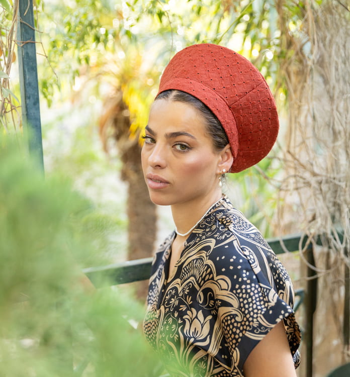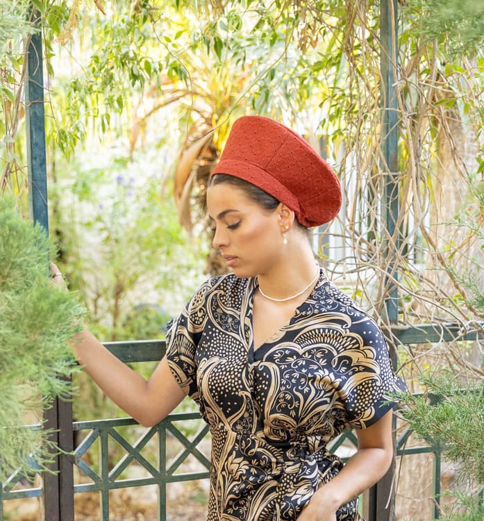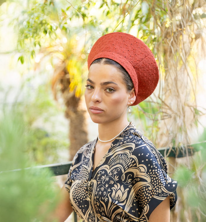 כובע ברט טליה בצבע חמרה - צבע שמכניס חמימות ועוצמה לכל לוק. גוון חמרה עמוק עם מרקם טבעי ורך, שזור בנגיעות לבנות מהבטיסט שמתחת - בדיוק השילוב שמשדר סטייל עם עומק.